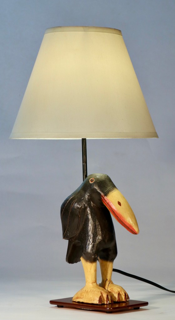 Hand carved and slightly worn wooden bird looks kind of spaced out.