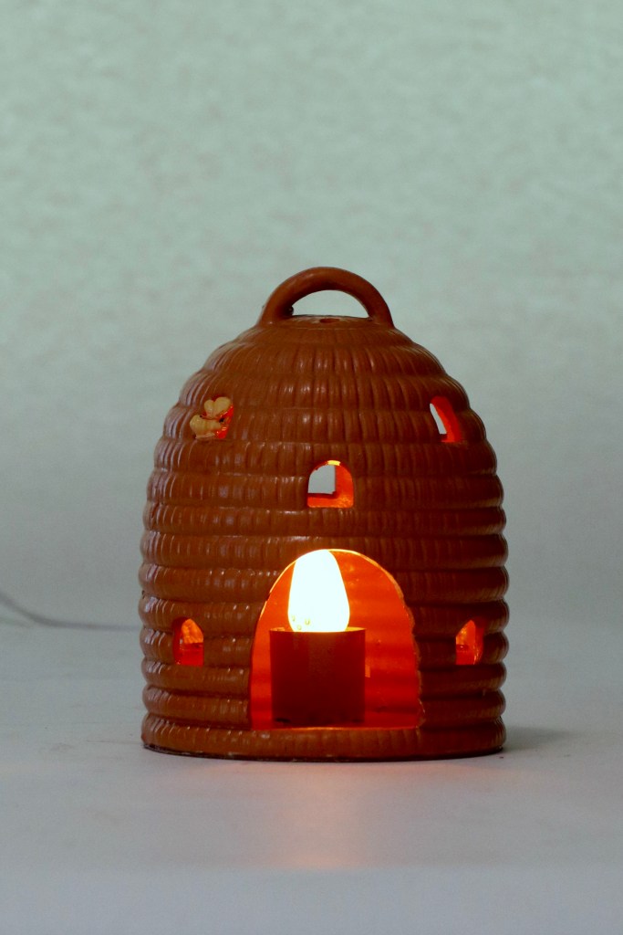 Ceramic honey home has candelabra bulb inside for a warm glow. Additional bulbs included.