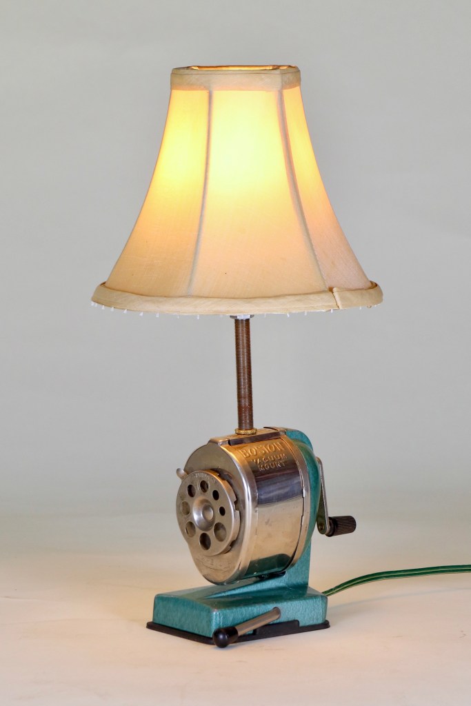 This advanced model clamps on a smooth surface. Blades have been removed and the crank turns, but it can no longer sharpen pencils.