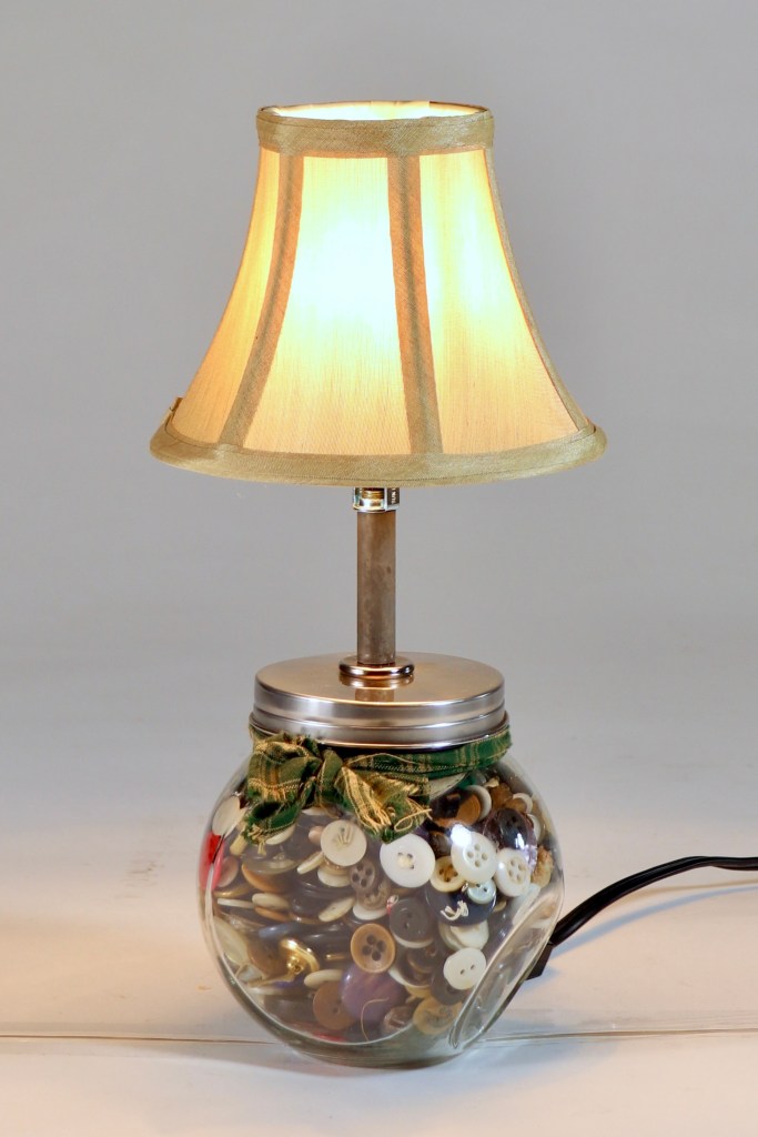 Button Jar Lamp Vintage glass jar packed to the top with assorted buttons. 13 inches tall, line switch. $45 SOLD