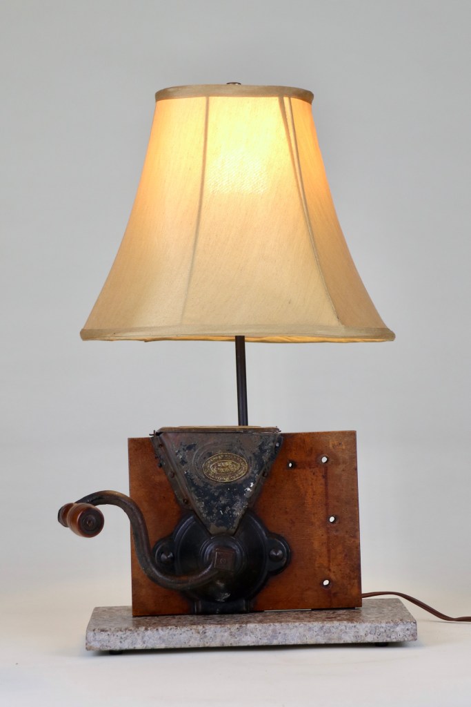 Coffee Grinder Lamp Antique wall mount coffee grinder on barn board base. Caffeine free. 21 inches high, switch on socket. $75 SOLD-AM24