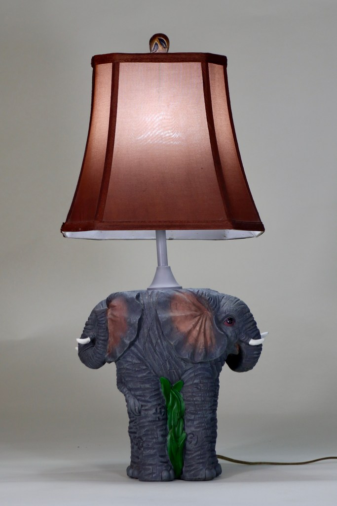 Elephant Twins Lamp Papier-mâché back-to-back pachyderms under a vintage shade. 22 inches tall, switch on socket. $65 SOLD-MA