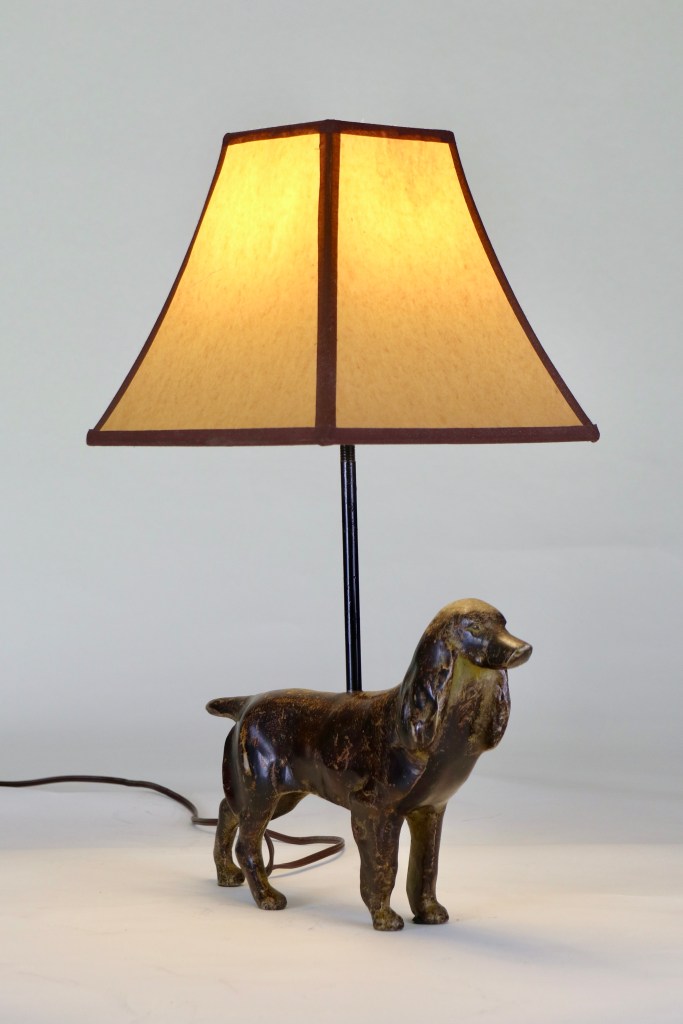 Iron Dog Lamp Vintage cast iron canine once stood guard as a doorstop. 19 inches tall, switch on socket. $75 SOLD-DS