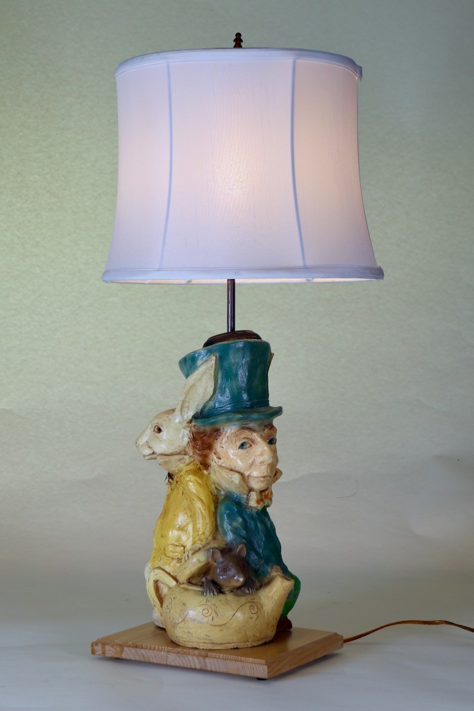 The Mad Hatter matched with his partner in crime — the March Hare. Detailed resin figures each peek out at… Alice?