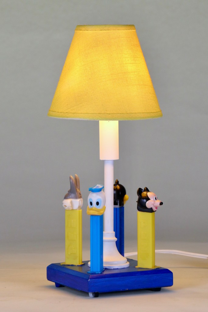 Four working (Bugs, Mickey, Donald and Daffy) PEZ dispensers on wood base.