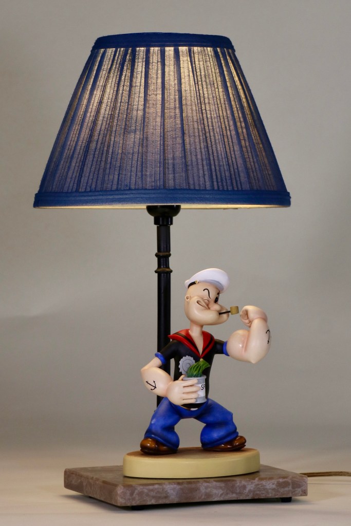 Detailed resin figure on marble base clutches can of what else..spinach!
