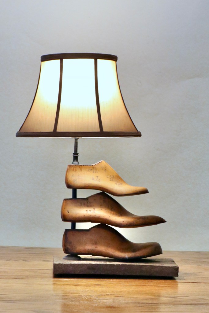 Men’s, women’s and child’s carved wooden shoe forms stacked on a barn board base. Original size markings etched on the sides of the forms.