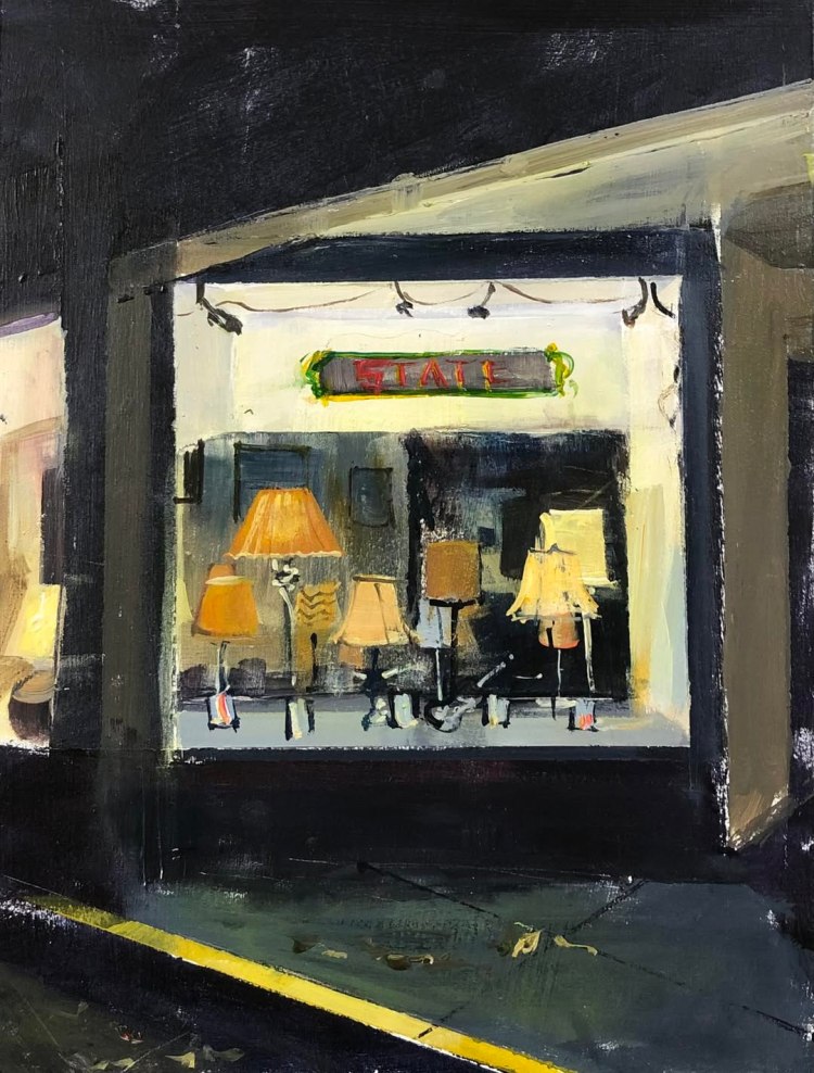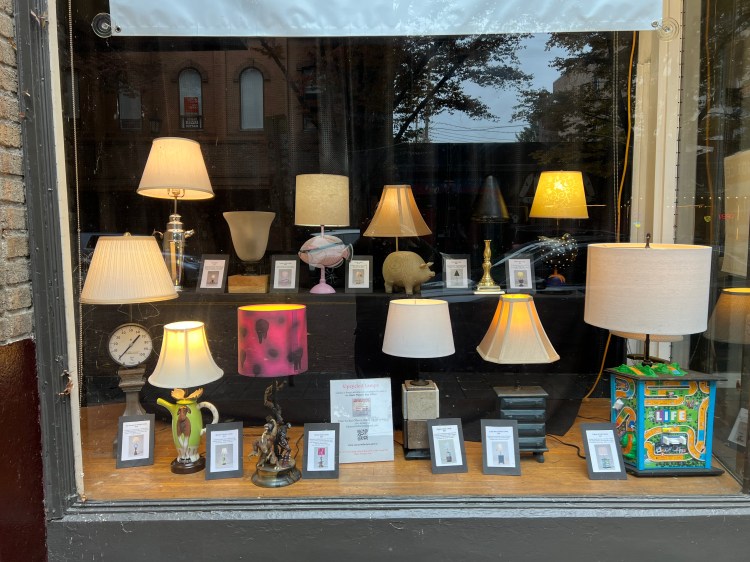 With 25% of each lamp sold going to the nonprofit, this mutually beneficial arrangement provides the State with a little extra cash (donations from sales were $1,583 in 2025 alone) and a constantly changing window display, and gives Upcycled Lamps a downtown Ithaca outlet. One of the windows was even immortalized in a painting by local artist Austin MacRae. That brought me great joy!