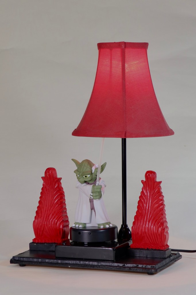 Yoda amidst fiery pillars. Use your imagination to flesh out the scenario. Sensitive motion sensor triggers sword and Yoda sound (option to disable the sensor when you are no longer feeling the force).